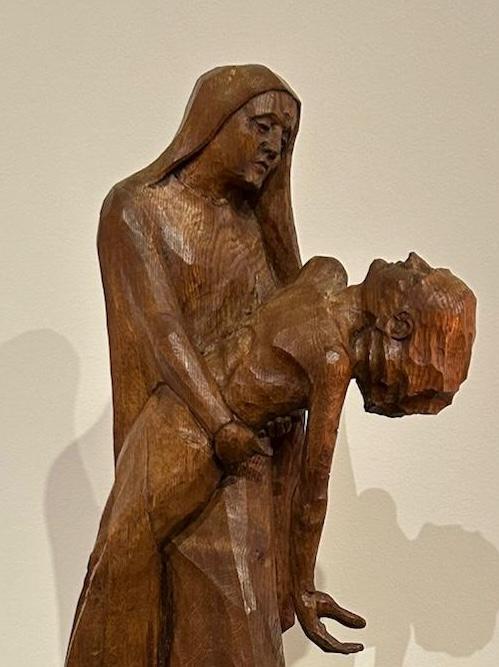 In der Fastenzeit steht diese Skulptur aus Holz im Altarraum und wir sind eingeladen innezuhalten und sie anzuschauen.